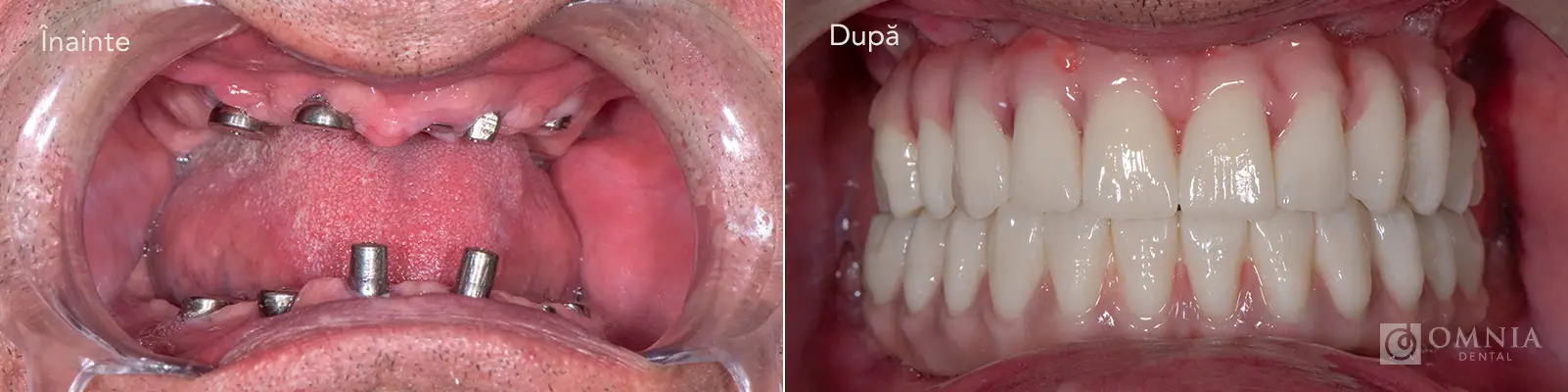 Reabilitare orală completă prin inserarea a câte 6 implanturi dentare pe arcadă, urmate de realizarea unor lucrări protetice fixe care restabilesc funcția și estetica zâmbetului.