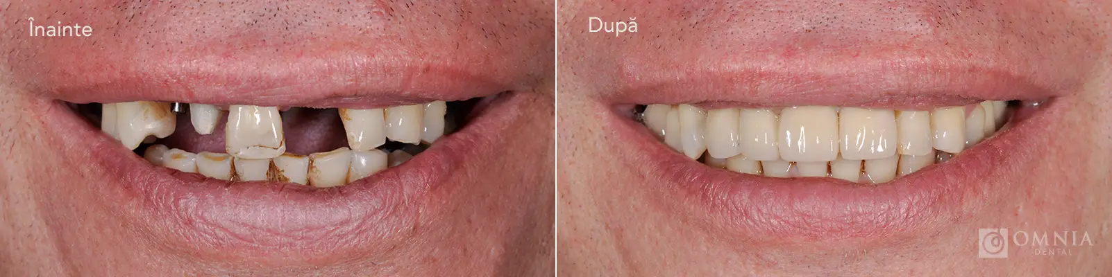 Pacientul prezenta mai multe spații edentate și dinți afectați. Tratamentul a inclus inserarea implanturilor dentare și realizarea coroanelor protetice pe implanturi și pe dinții naturali.