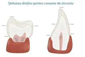 - Coroanele de zirconiu necesită șlefuirea de la 0,5-0,7 mm până la aproximativ 2 mm.
